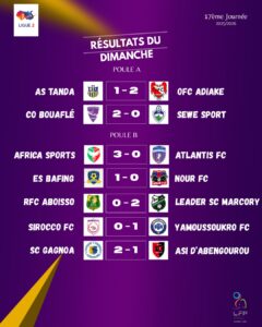 Après trois semaines de disette, l’Africa Sports a enregistré sa première victoire de la phase retour de la Ligue 2, dans la poule B. En effet, les Aiglons ont dynamité Atlantis FC de Dimbokro, hier, au stade Robert Champroux de Marcory (3-0). Kzys Koutou Yannick (1ère), Coulibaly Youbah (40e) et Koné Pitcho (69e) ont été les bourreaux de la formation de Dimbokro. Le réveil brutal des Vert et Rouge peut être qualifier de signal fort donné au grand rival, Asec Mimosas, avant le derby des 16e de finale de la Coupe nationale En tout cas, cette victoire éclatante met en confiance Bazemo Clovis et ses coéquipiers avant d’affronter l’Asec Mimosas en Coupe nationale.